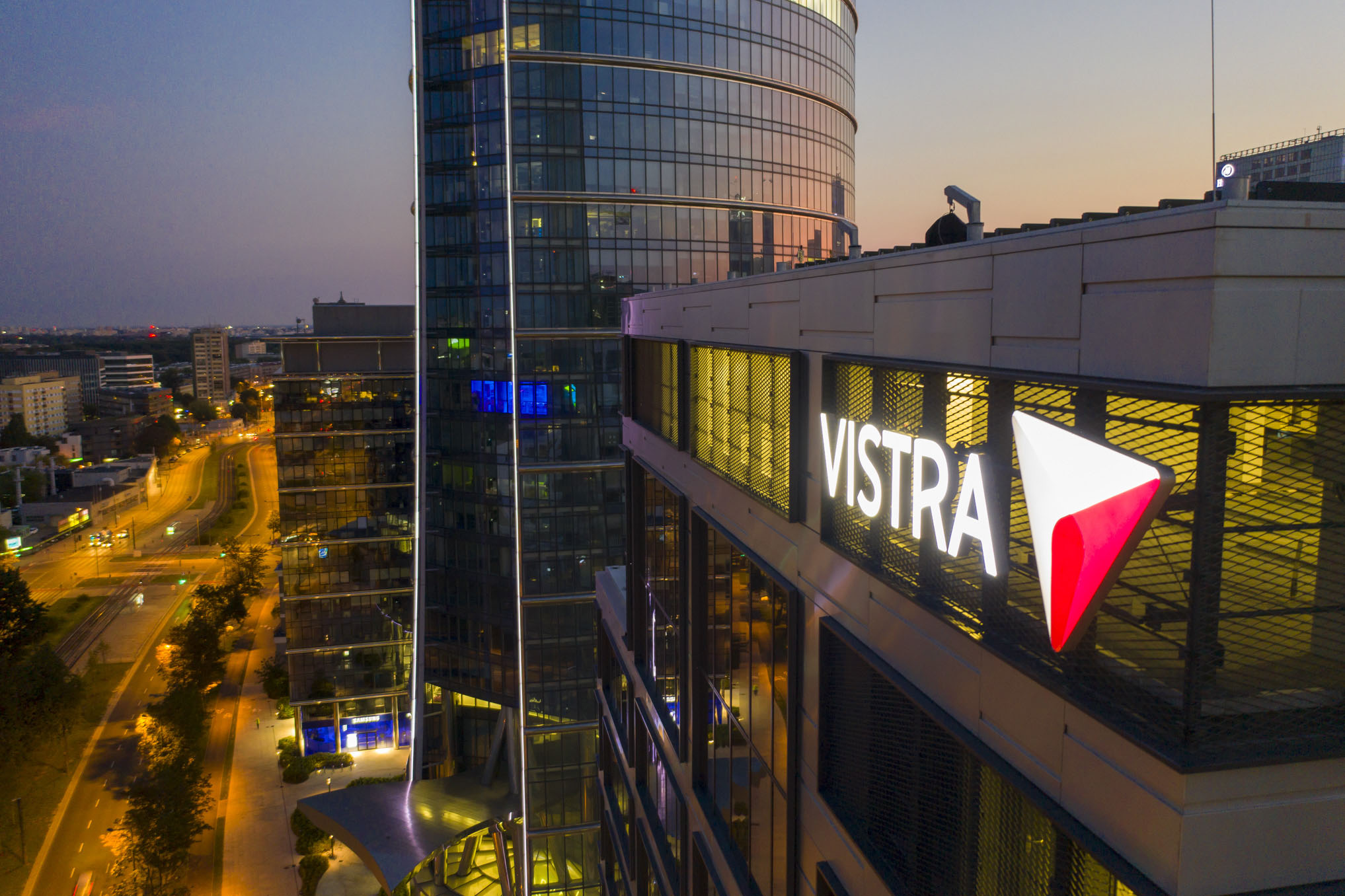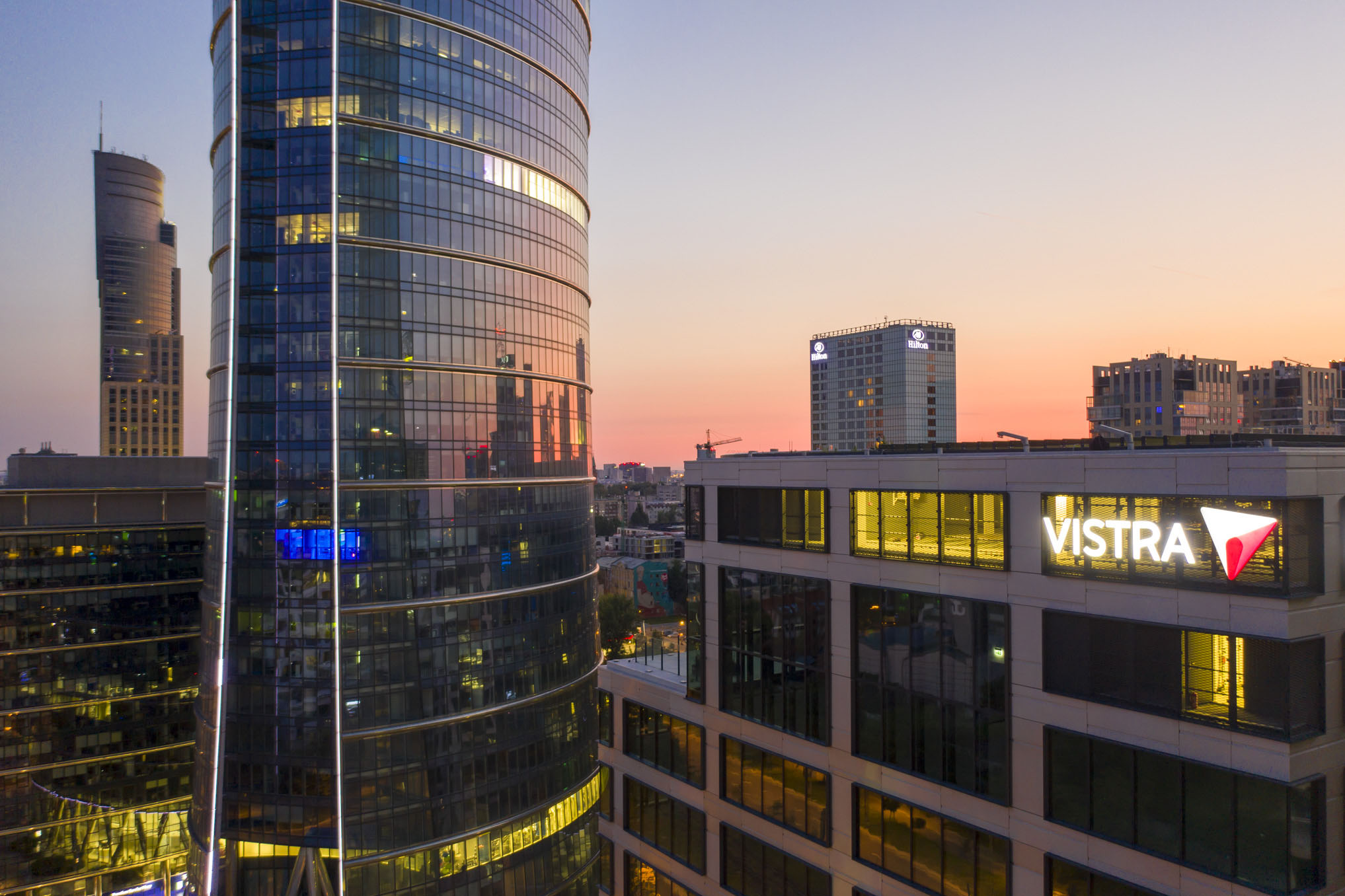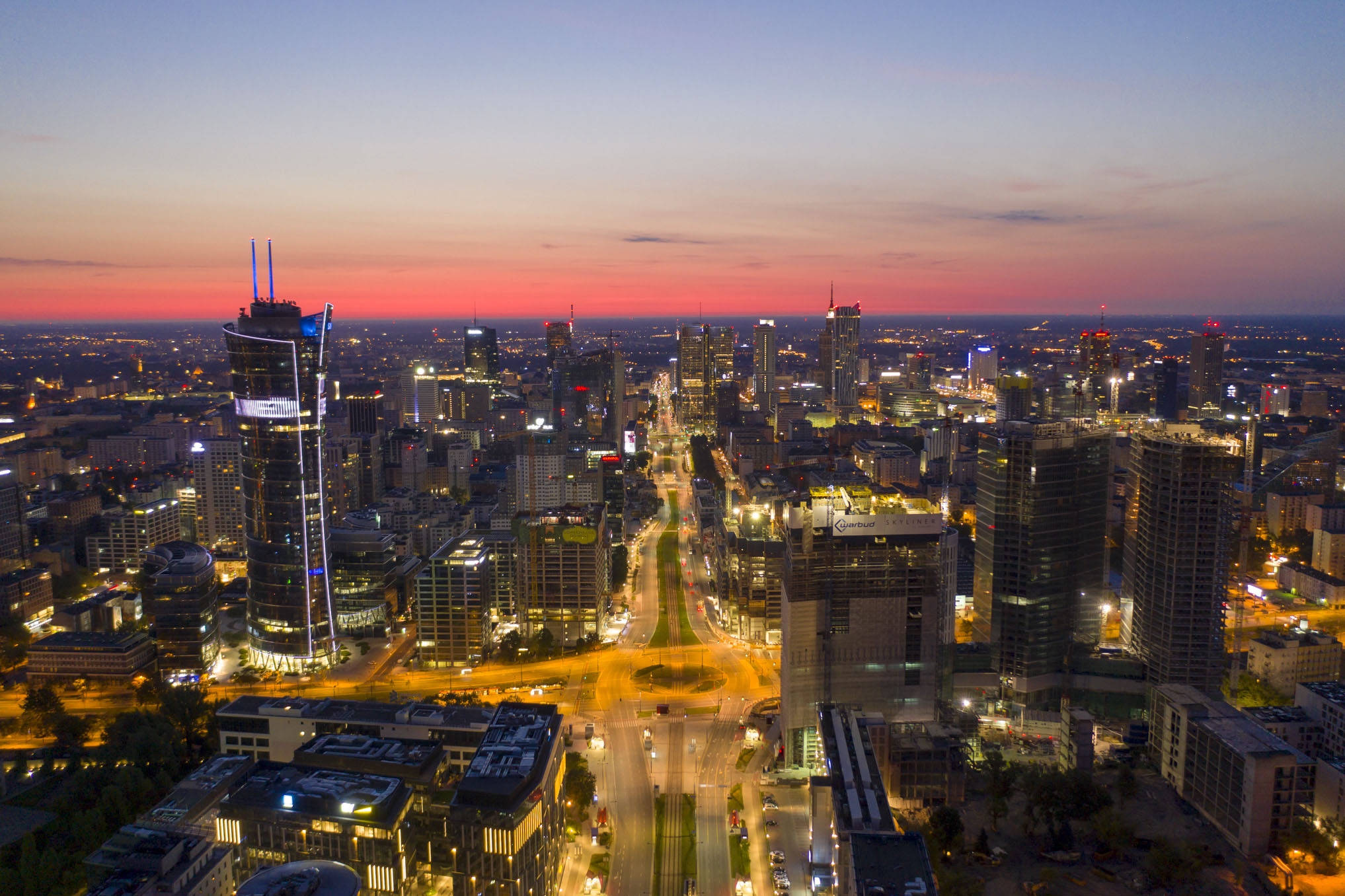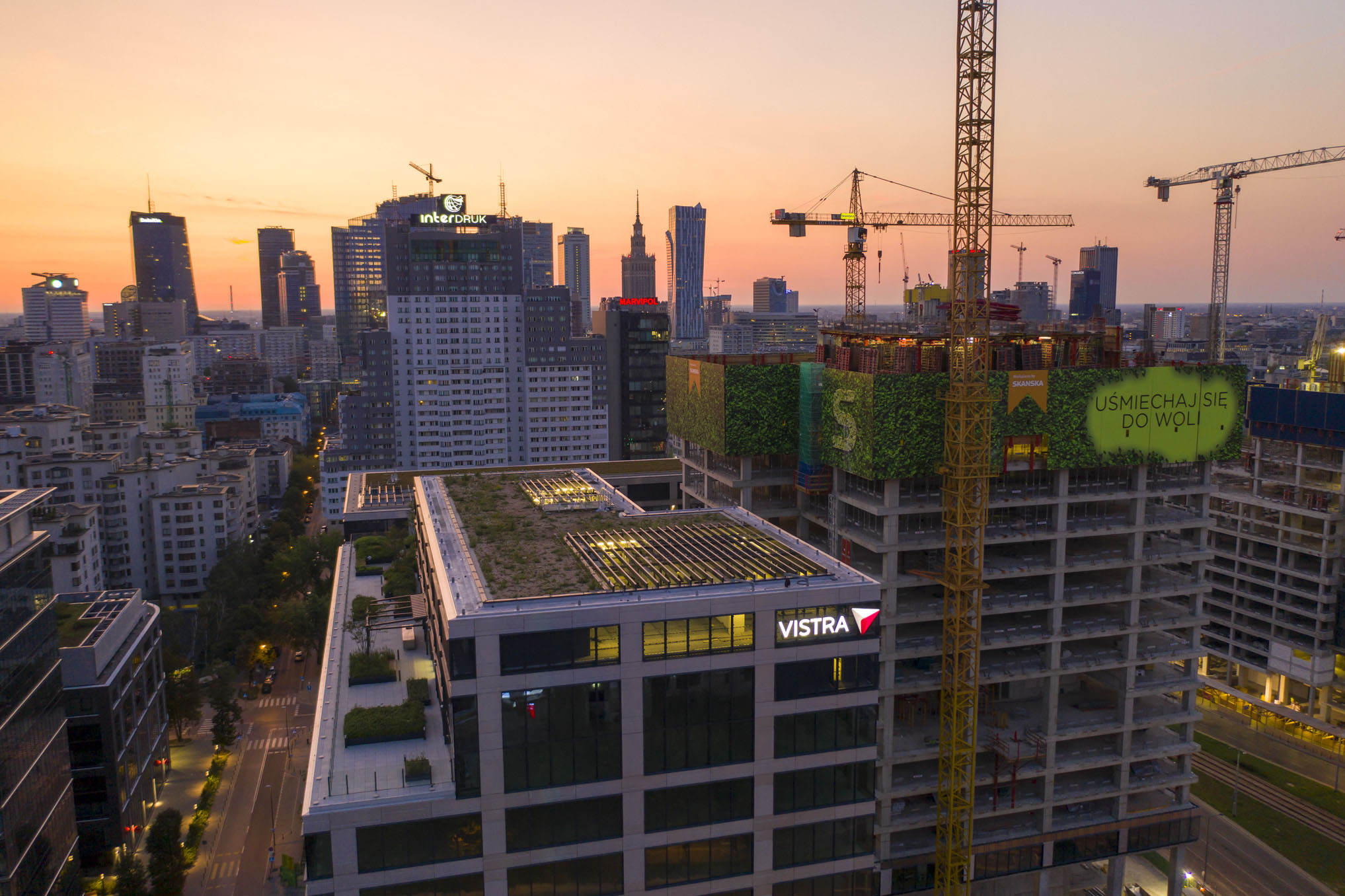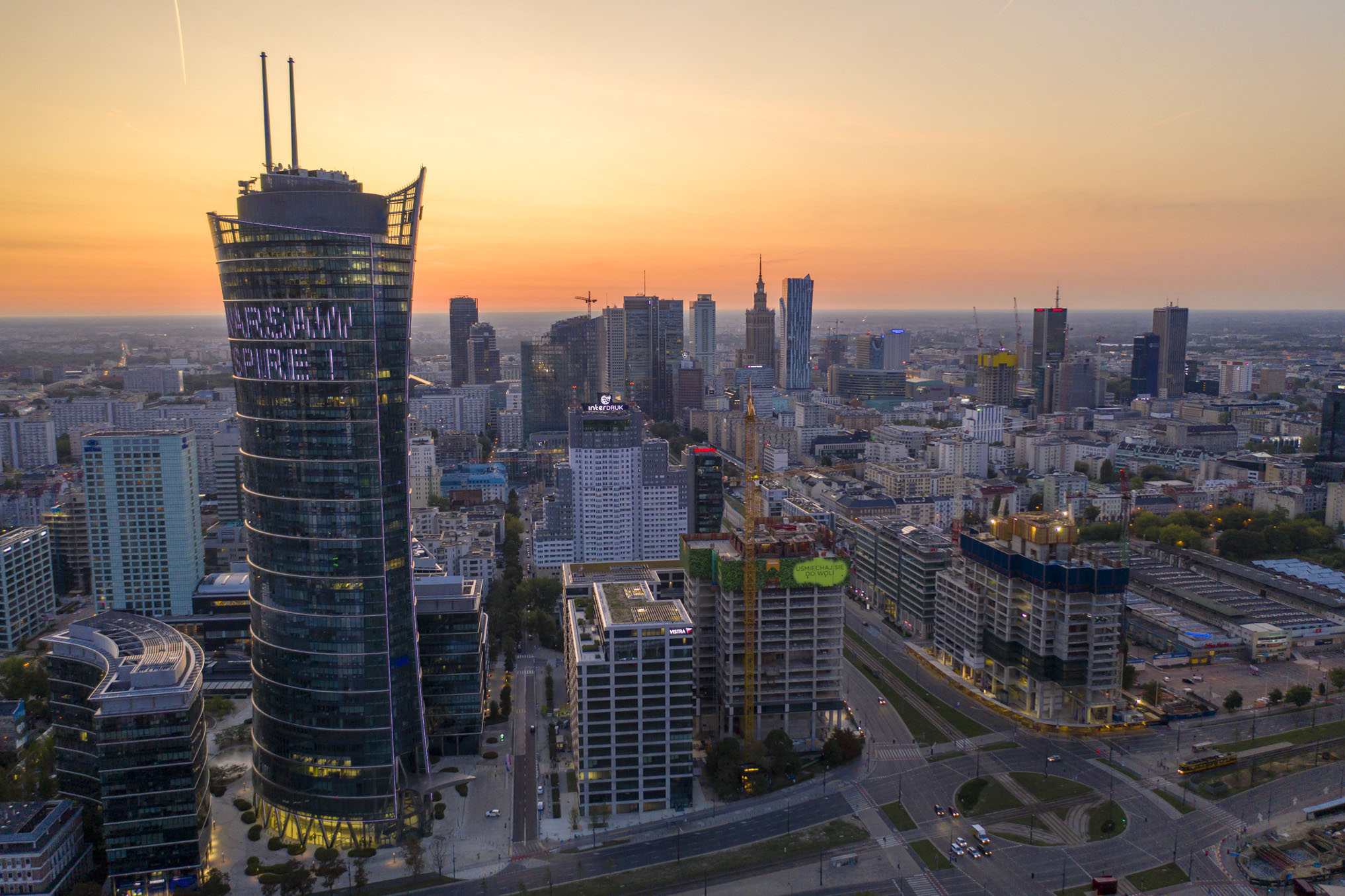 Dronowa sesja w centrum Warszawy o wschodzie słońca prezentująca nową siedzibę firmy.