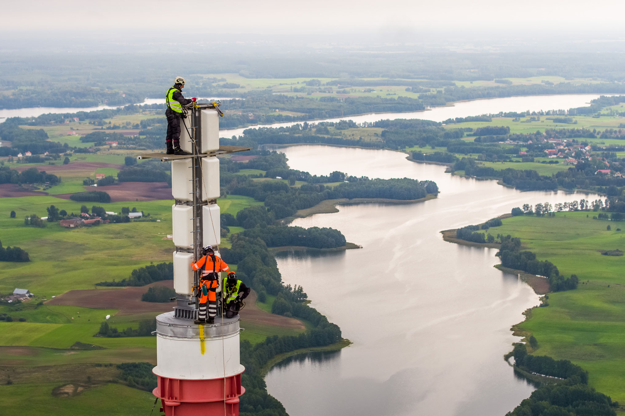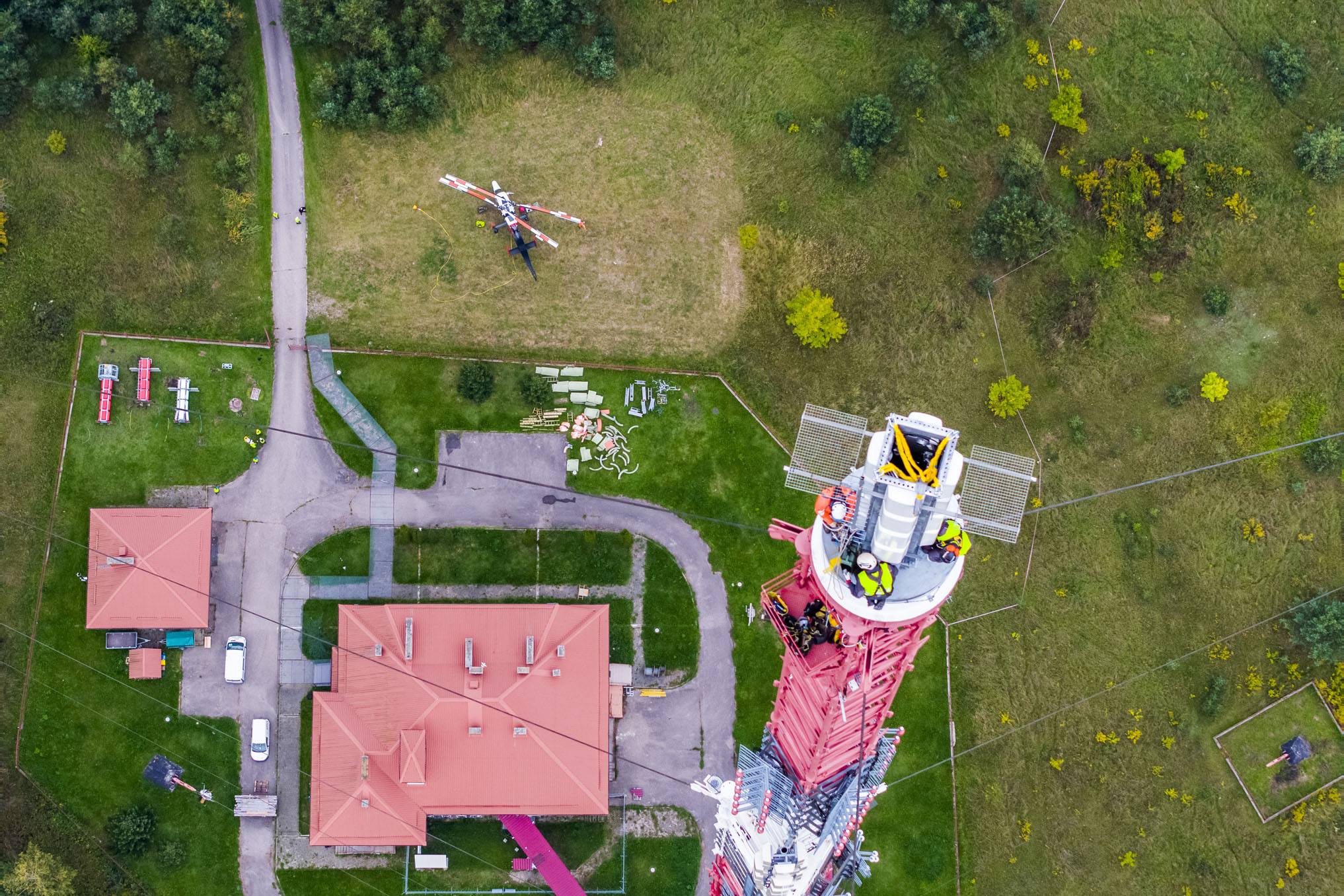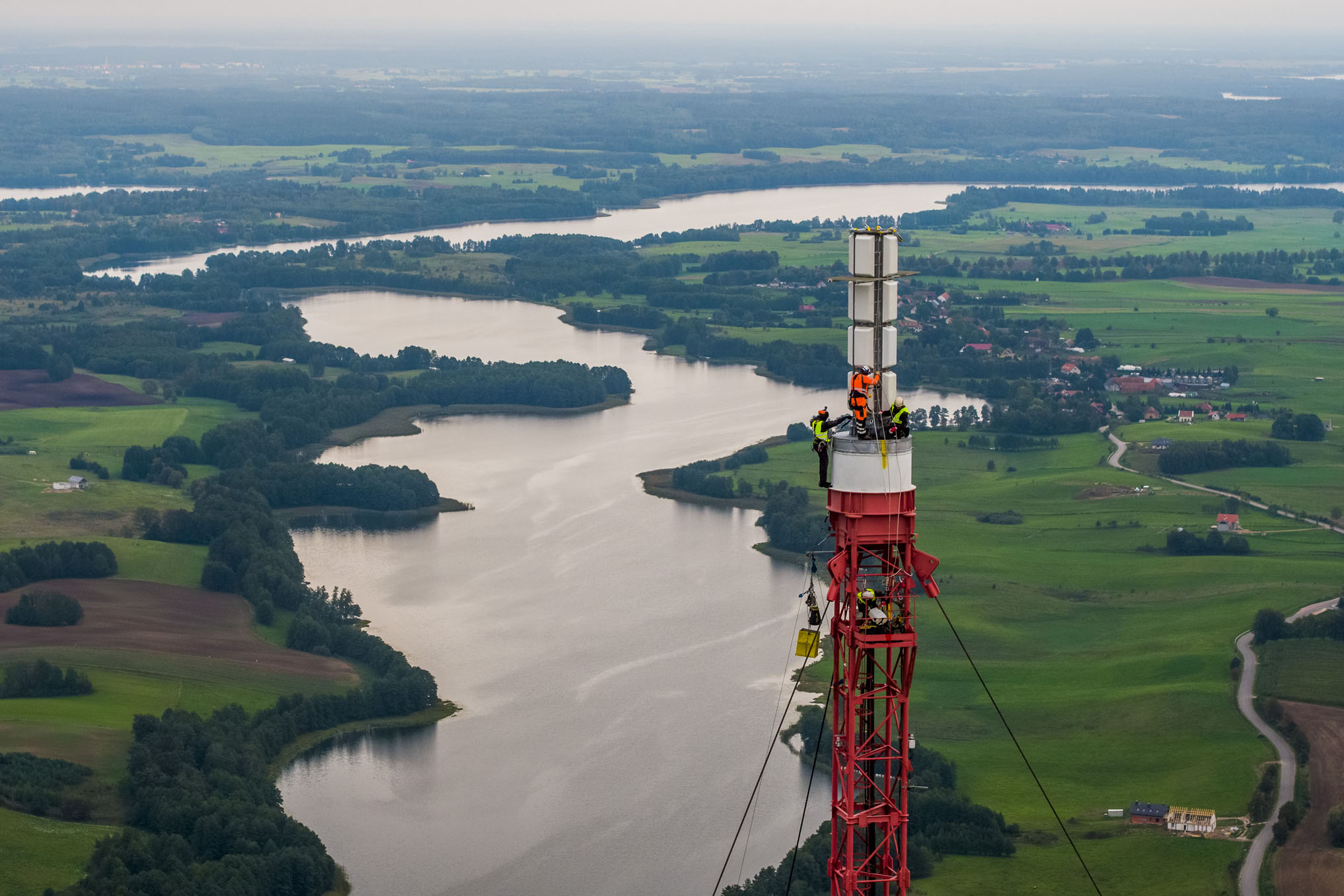 Realizacja materiałów filmowych oraz fotograficznych z ziemi oraz z drona dokumentująca wymianę anteny na czubku ponad 300-metrowego masztu w Giżycku-Miłkach.